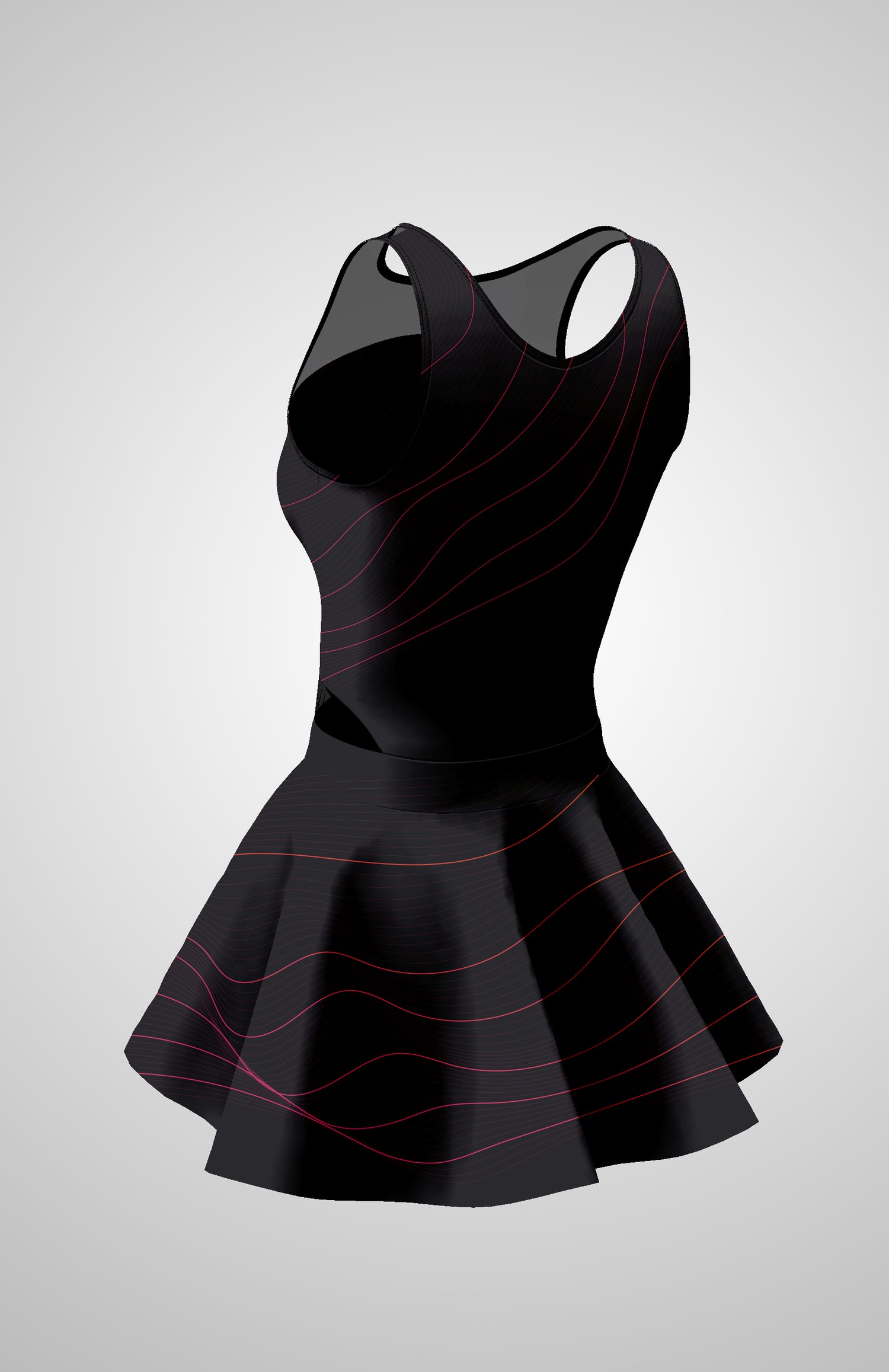 The deep black color with subtle pink lines creates a sense of movement, energy, and control.